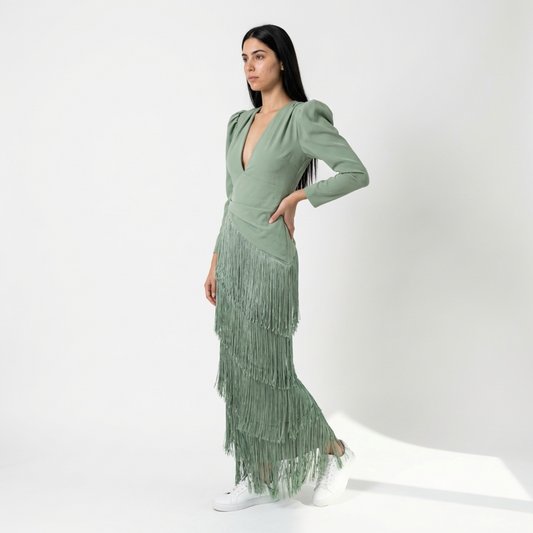 שמלת מידי עם שרוולים רחבים ופרנזים בגוון ירוק מרווה