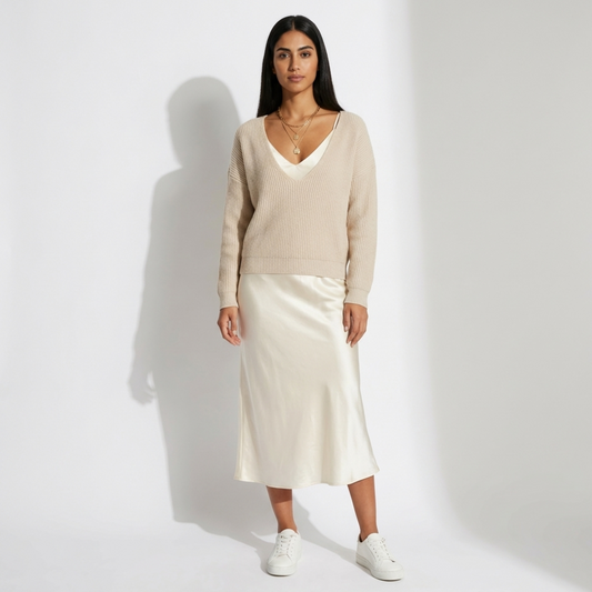 SAVE 38%סריג וי רחב בגוון בז' בהיר