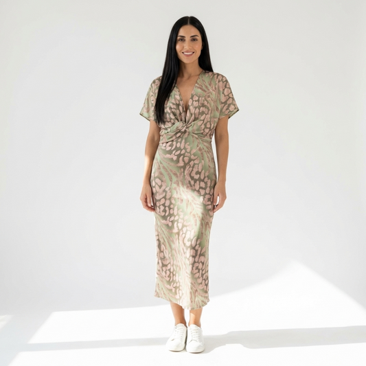 שמלת מעטפת בהדפס מופשט בגווני ירוק וורוד עתיק