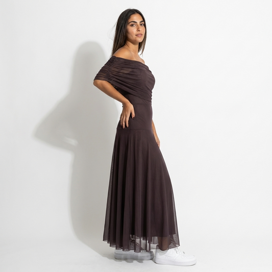 שמלת מקסי נשפכת עם כתפיים חשופות בגוון אפור-כסוף