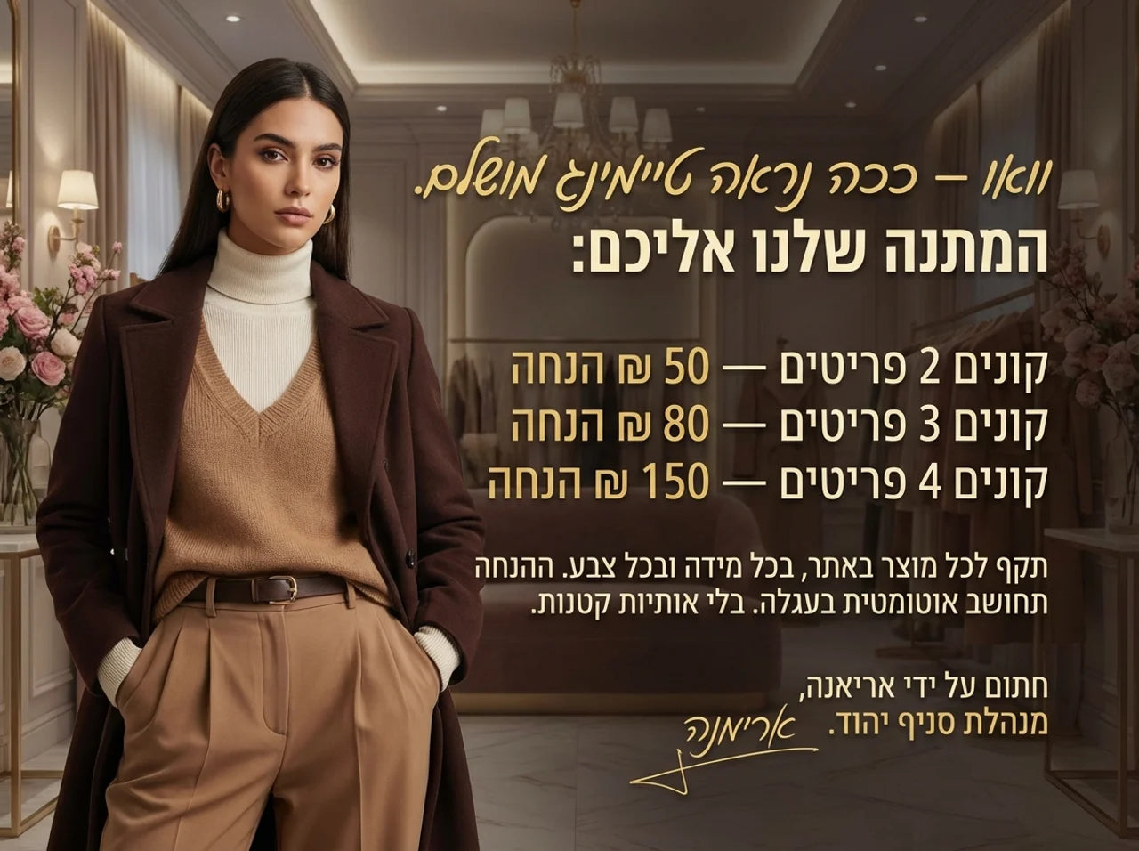 יצאנו במבצע נוסף בעקבות ההשקות החדשות שלנו, וכעת כל פעם שתזמינו 2 יחידות אתן תקבלו 50 ש״ח מתנה מהזמנה, אם תזמינו 3 יחידות אתן תקבלו 80 ש״ח הנחה, אם תזמינו 4 יחידות אתן תקבלו 150 ש״ח הנחה. *תקף לכל מוצר, לכל צבע באתר, ההנחות מופעלות בצורה אוטומטית